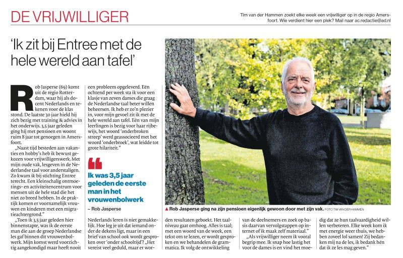 Rob Jasperse (69) komt uit de regio Rotterdam, waar hij als docent Nederlands en tekenen voor de klas stond. De laatste 30 jaar hield hij zich bezig met training & advies binnen het onderwijs. 3,5 Jaar geleden ging hij met pensioen en woont ruim 8 jaar tot genoegen in Amersfoort. ,,Naast tijd besteden aan vakanties en hobby’s heb ik bewust gekozen voor vrijwilligerswerk. Met mijn oude vak, lesgeven in de Nederlandse taal voor anderstaligen. Zo kwam ik bij stichting Entree terecht. Een kleinschalig ontmoetings- en activiteitencentrum voor mensen uit de de stad die het niet zo breed hebben. In de praktijk komen er voornamelijk vrouwen en kinderen met een migratieachtergrond.” Entree startte 22 jaar geleden, specifiek om anderstalige vrouwen uit hun huis en isolement te halen. Er worden Nederlandse taallessen voor volwassenen gegeven, huiswerkbegeleiding voor kinderen, naailes en Entree fungeert als sociaal informatiepunt. Alle activiteiten worden begeleid door 85 onbezoldigde vrijwilligers. ,,Toen ik drie-en-een-half jaar geleden hier binnenstapte, was ik de eerste man les gaf aan een groepje binnen dit vrouwenbolwerk. Mijn komst werd voorzichtig aangekondigd maar heeft nooit een probleem opgeleverd. Eén ochtend per week sta ik voor een klasje van zeven dames die graag de Nederlandse taal beter willen beheersen. Ik heb er zo’n plezier in, voor mijn gevoel zit ik met de hele wereld aan tafel. Eén van mijn leerlingen is bezig voor haar rijbewijs, het woord ‘onderbroken streep’ werd geassocieerd met het woord ‘onderbroek’, wat leidde tot grote hilariteit.” Het Arabisch heeft vaste regels, de Nederlandse taal is niet altijd gemakkelijk. Hoe leg je uit dat iemand onder de dekens ligt, maar in een brief van school ook wordt gesproken over ‘onder schooltijd’? ,,Het vereist veel geduld, maar er worden resultaten geboekt. Het taalniveau gaat omhoog. Alles is taal, we hebben een woord van de week, een tekst om te lezen, er wordt gesproken en we behandelen de grammatica. Ik volg geen specifieke methode, maar zoek vervolgstappen op internet.” ,,Als vrijwilliger neem ik vooral begrip mee. Ik snap hoe lastig het voor de dames is en vind het moedig dat ze hun taalvaardigheid willen verbeteren. Elke week kom ik met energie weer thuis, we hebben zoveel lol samen! Zij bedanken mij na de les, ik bedank hén dat ik ze les mag geven.”
