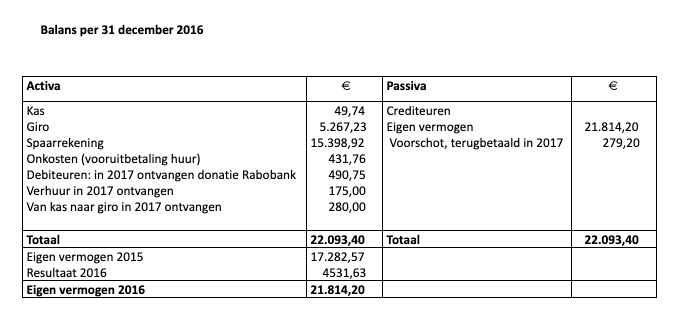 Door de in 2015 ontvangen subsidie en de sponsorgelden en andere inkomsten was er een batig saldo van 13.000 en kwam het eigen vermogen op € 17.000.