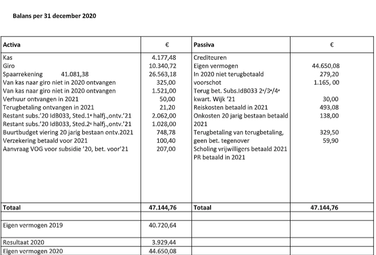 Door de in voorgaande jaren ontvangen sponsorgelden en andere inkomsten was er een eigen vermogen ontstaan van € 40.720,64. Doordat de balans van 2020 toch nog een batig saldo liet zien steeg het eigen vermogen naar 44.650,08. Dit geeft ons een goede buffer.