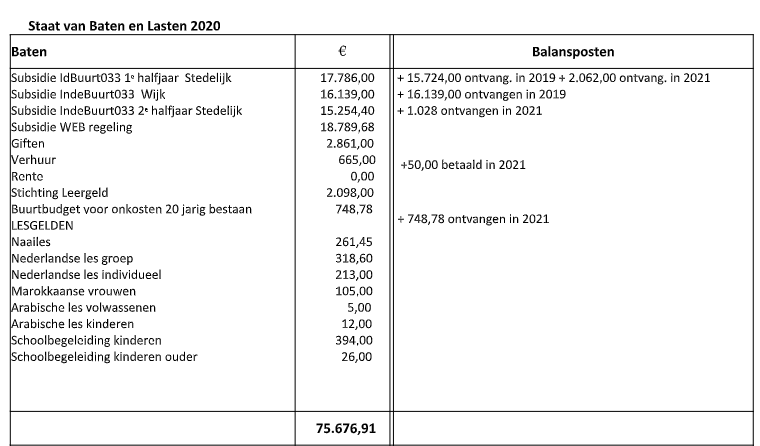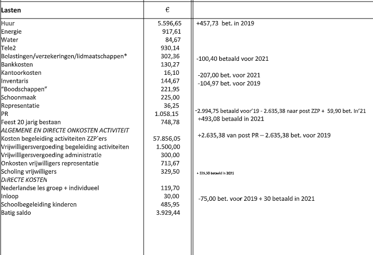 Ook waren er onkosten voor de vrijwilligers voor scholing en een attentie. Het bestuur noch de vrijwilligers ontvingen een vergoeding.